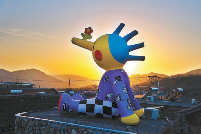 在进入美术馆之前,走在山间小道上,你会发现许多“彩蛋”散落在村落各处。艺术家雷磊的《刺猬头》就在一处民房屋顶上,沿着村子主干道向北,就能发现它。刺猬头的形象源自一部电影作品,故事中的男孩对爱人说谎,鼻子变长了,但却开出一朵善意小花。落日下,这座大大的充气人偶仿佛在静静观赏着夕阳,一位村里的老人提着一筐蔬菜路过,有种奇异的和谐感。