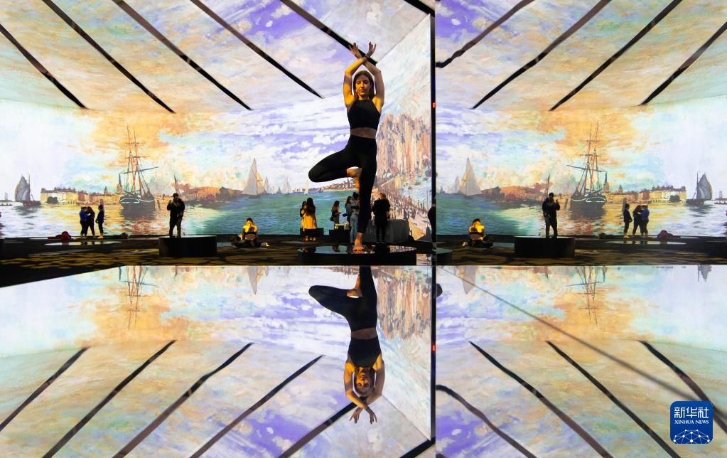12月2日,一名老师在加拿大多伦多沉浸式莫奈作品艺术展场馆中进行瑜伽动作示范。新华社发(邹峥摄)