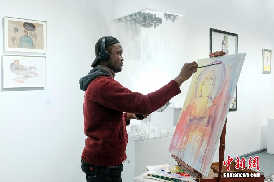 12月15日,由韩国、意大利、蒙古国、刚果(金)、波兰、俄罗斯以及中国国内画家、摄影师等组成的艺术团队在拉萨艺术盒子与当地创作团队现场交流,部分艺术家在连续多日采风后,以西藏元素进行现场作画。图为12月15日傍晚,来自刚果(金)的艾为(Mbelo Mantinga Herve)在拉萨创作一幅佛像主题的画作,据悉,他现在就读于中国美术学院油画系,攻读硕士学位。 中新社记者 江飞波 摄