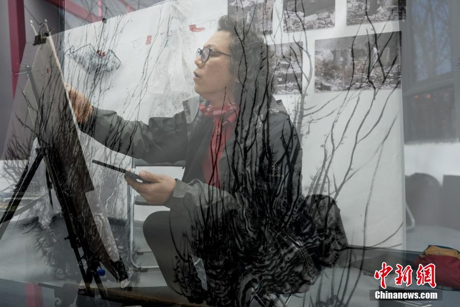 12月15日,由韩国、意大利、蒙古国、刚果(金)、波兰、俄罗斯以及中国国内画家、摄影师等组成的艺术团队在拉萨艺术盒子与当地创作团队现场交流,部分艺术家在连续多日采风后,以西藏元素进行现场作画。图为12月15日,韩国画家柳时浩(Ryu-Siho)在拉萨进行现场创作,据悉,其博士毕业于中国艺术研究院,主攻中国画。(双重曝光拍摄) 中新社记者 江飞波 摄