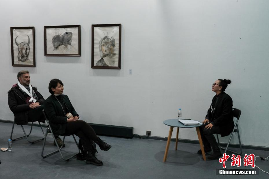12月15日,由韩国、意大利、蒙古国、刚果(金)、波兰、俄罗斯以及中国国内画家、摄影师等组成的艺术团队在拉萨艺术盒子与当地创作团队现场交流,部分艺术家在连续多日采风后,以西藏元素进行现场作画。图为12月15日傍晚,中外艺术家赴藏采风团在拉萨艺术盒子,与当地创作团队进行交流,了解西藏当代艺术相关情况等。 中新社记者 江飞波 摄