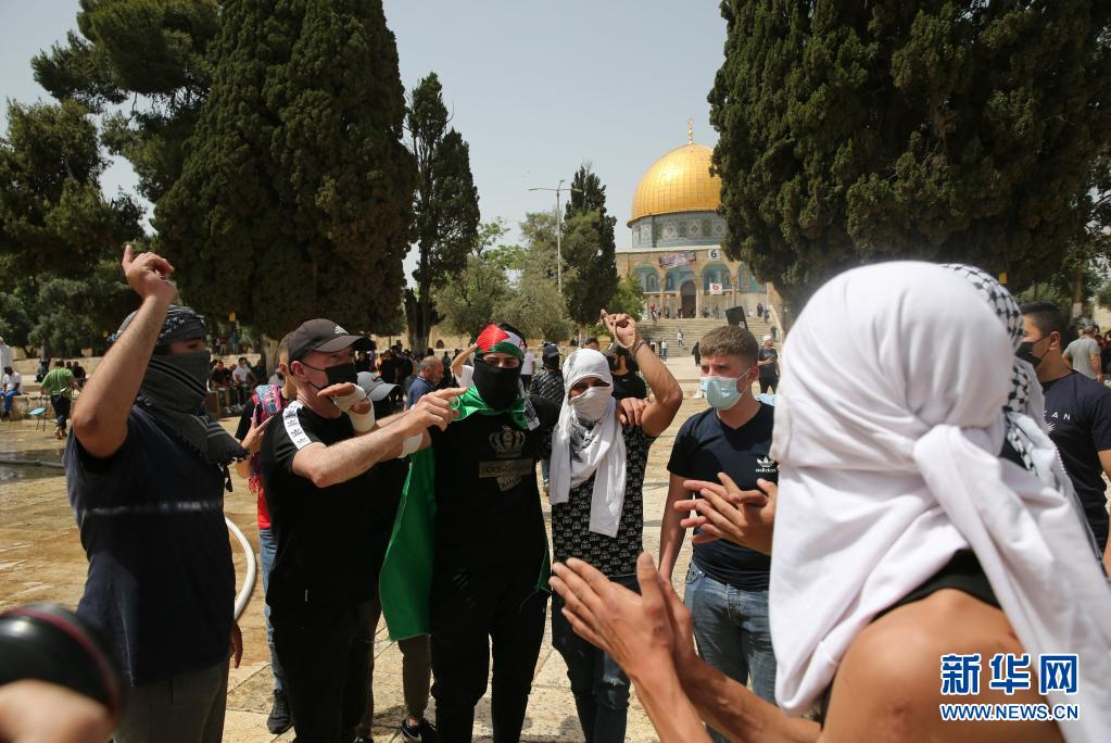 5月10日,在耶路撒冷老城圣殿山(穆斯林称“尊贵禁地”),巴勒斯坦民众参加抗议活动。