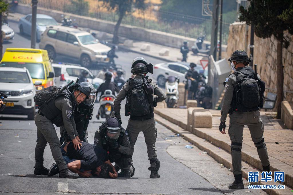 5月10日,在耶路撒冷老城圣殿山(穆斯林称“尊贵禁地”)附近,以色列警察逮捕一名巴勒斯坦示威者。