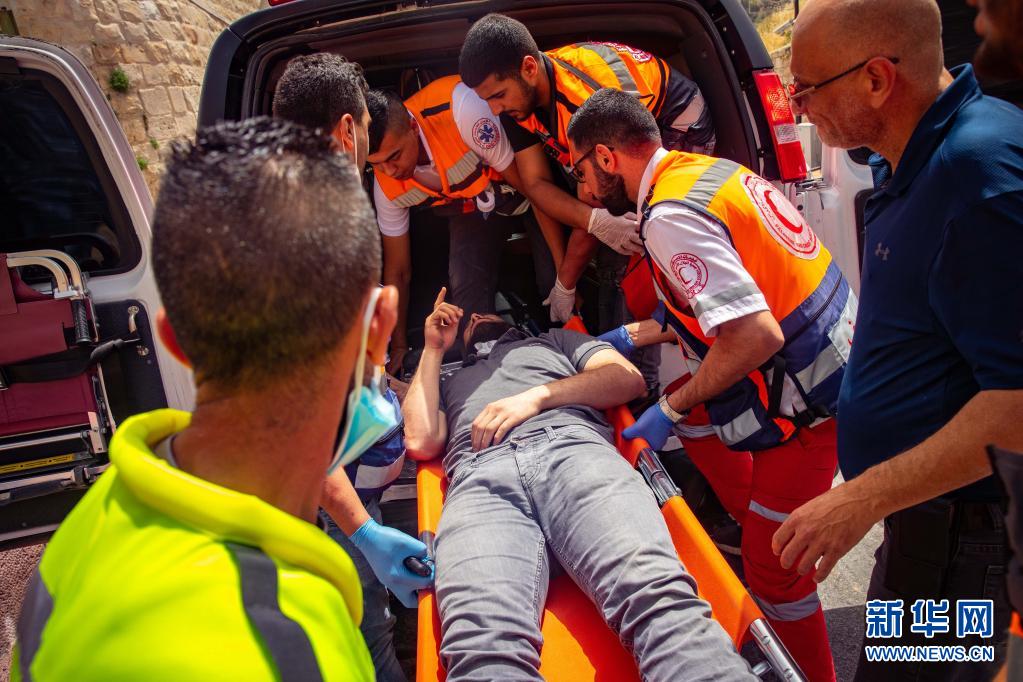 5月10日,一名在耶路撒冷老城圣殿山(穆斯林称“尊贵禁地”)冲突中受伤的巴勒斯坦示威者被送医救治。