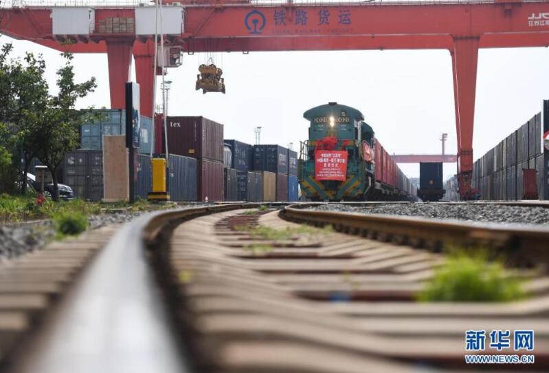 5月10日,在南京尧化门货场,南京至蒂尔堡中欧班列首发开行(无人机照片)。当日,江苏南京至荷兰蒂尔堡中欧班列从南京尧化门货场首发开行。班列满载液晶显示屏、工业机械配件、纺织服饰等100个标箱货物,将经由新疆阿拉山口出境,途经哈萨克斯坦、俄罗斯、白俄罗斯等国后抵达荷兰蒂尔堡市,全程用时18天左右。新华社记者 季春鹏 摄