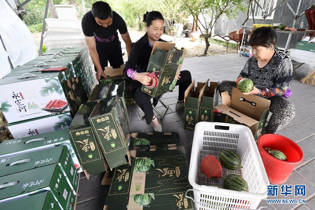 5月24日,北臧村镇永兴缘农产品产销专业合作社的员工在包装准备上市的西瓜。