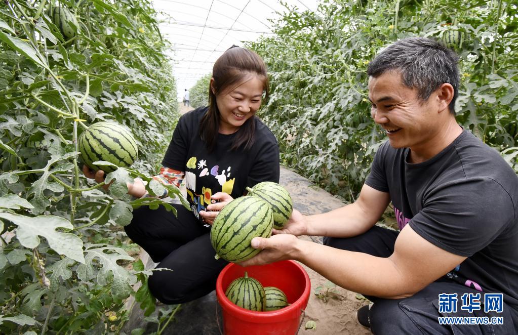 5月24日,北臧村镇永兴缘农产品产销专业合作社的员工在采摘西瓜。
