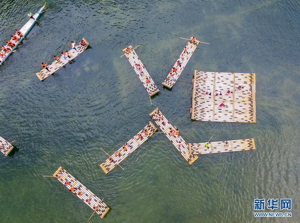 7月4日,在秭归县三峡竹海生态风景区内,民间艺人为游客表演国家级非遗项目“长江峡江号子”(无人机照片)。