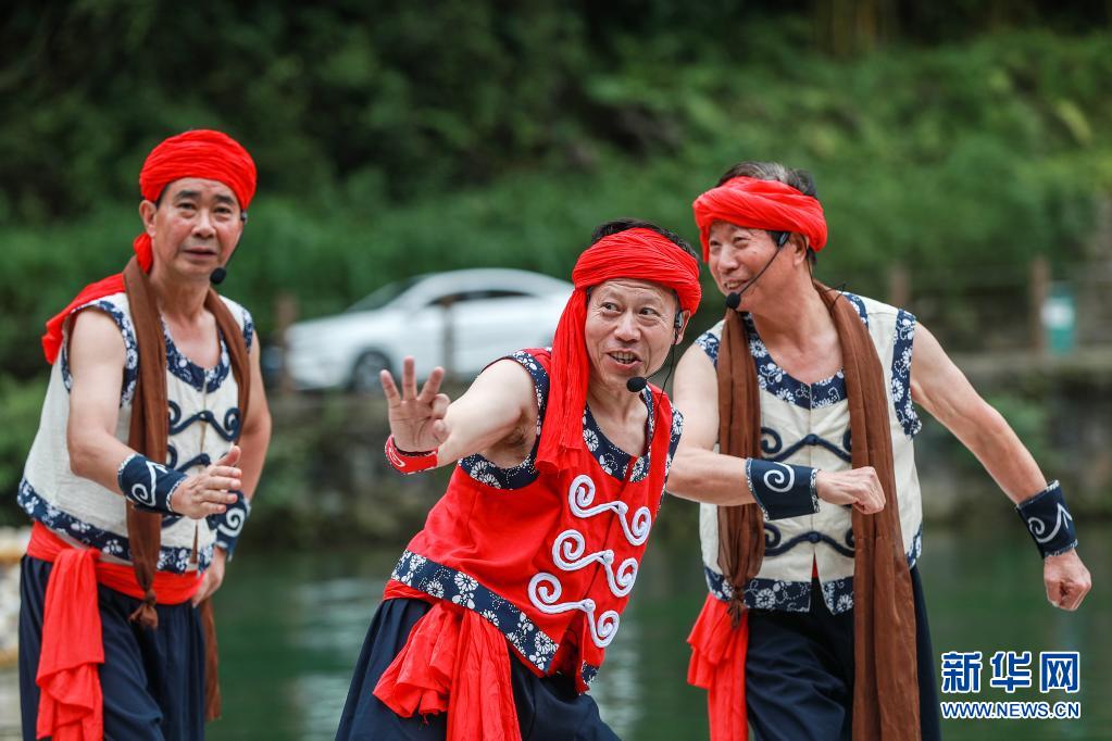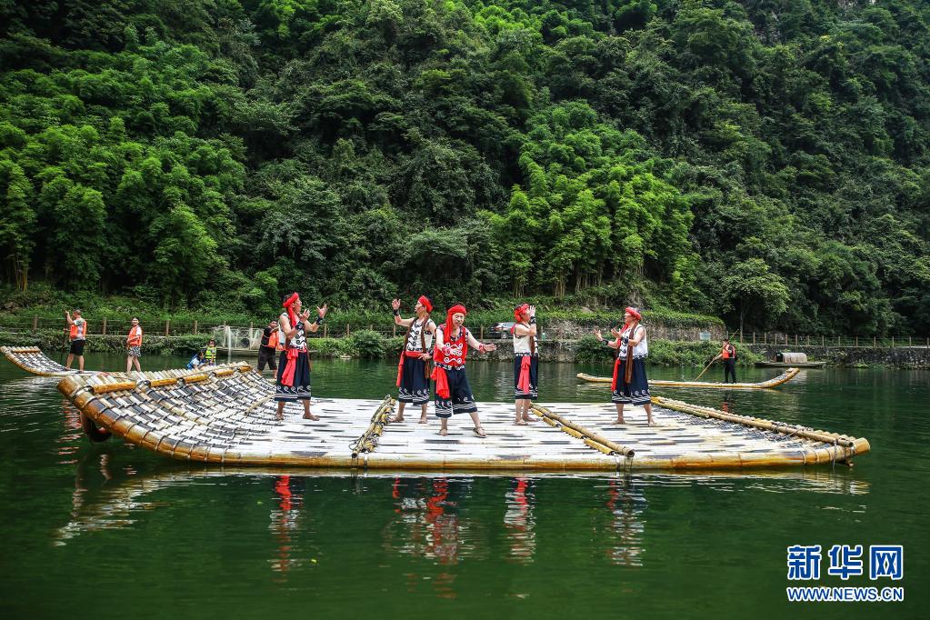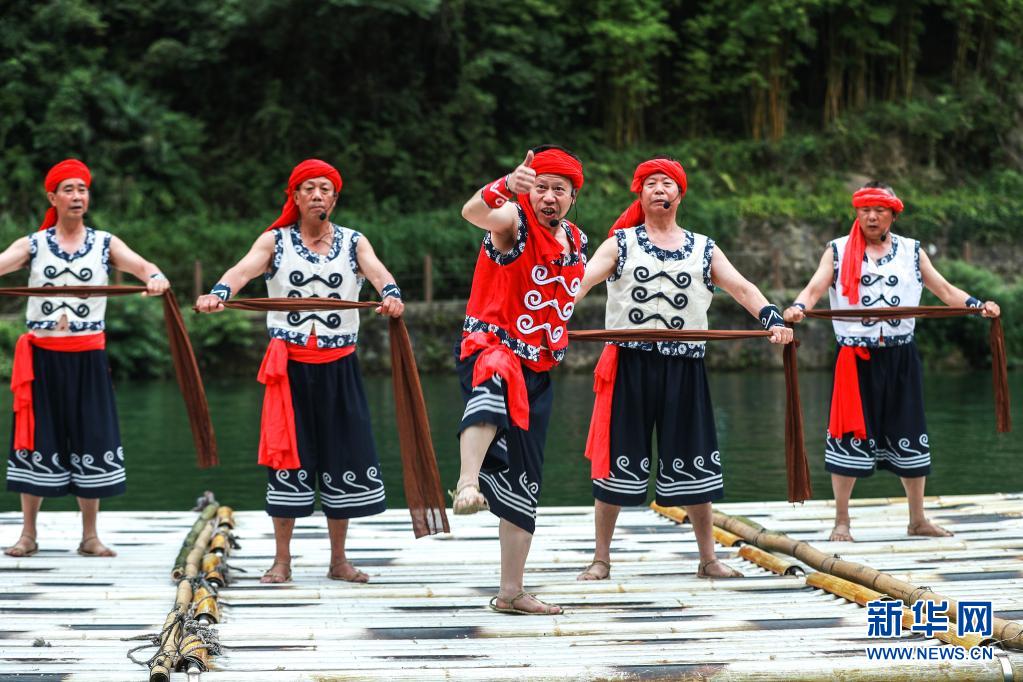 7月4日,民间艺人在秭归县三峡竹海生态风景区为游客表演国家级非遗项目“长江峡江号子”。