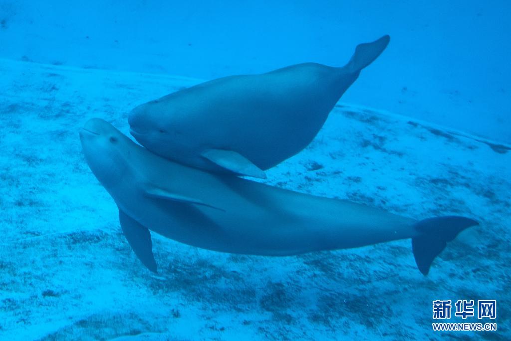 7月5日,江豚妈妈洋洋和小江豚YYC在水中游动。新华社记者肖艺九摄