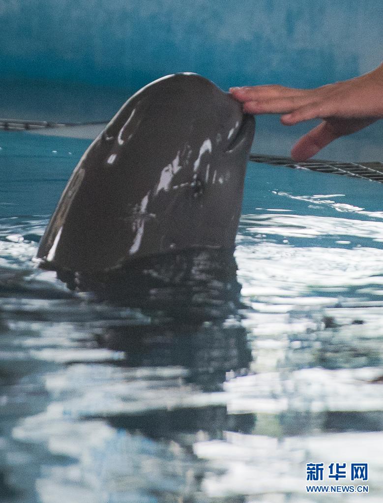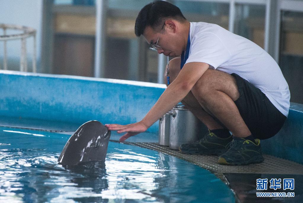 7月5日,中科院水生所白鱀豚馆饲养员对长江江豚进行训练。新华社记者肖艺九摄