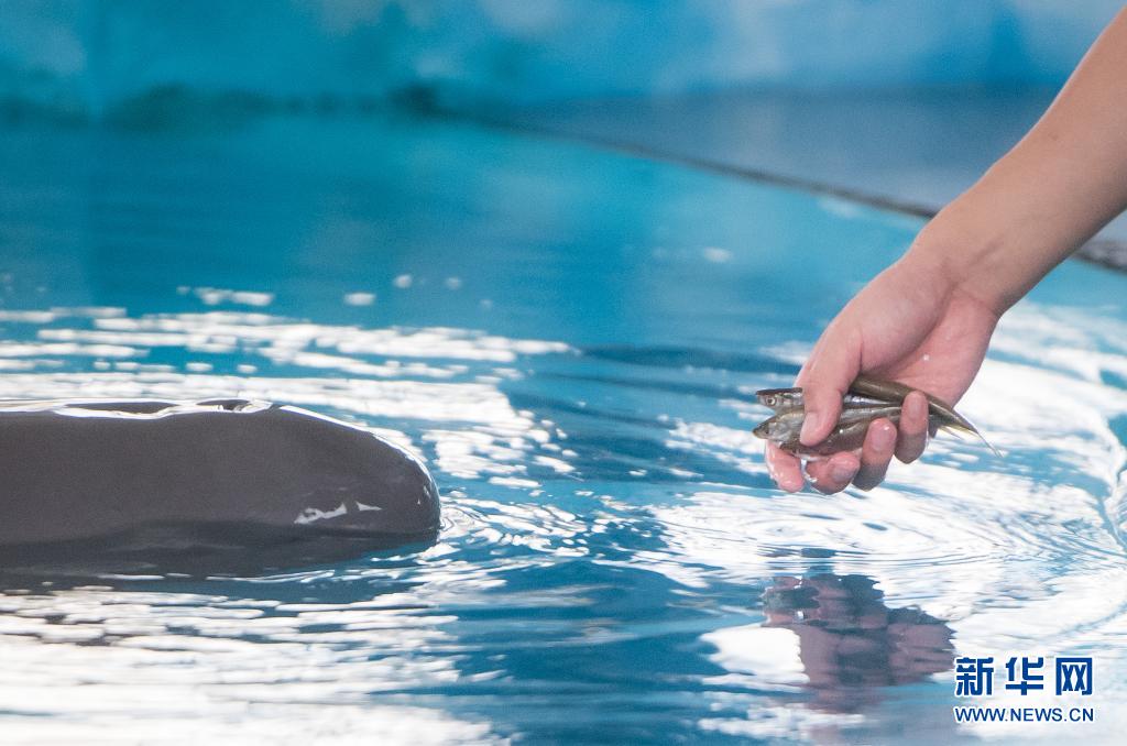 7月5日,中科院水生所白鱀豚馆饲养员给长江江豚喂食。新华社记者肖艺九摄