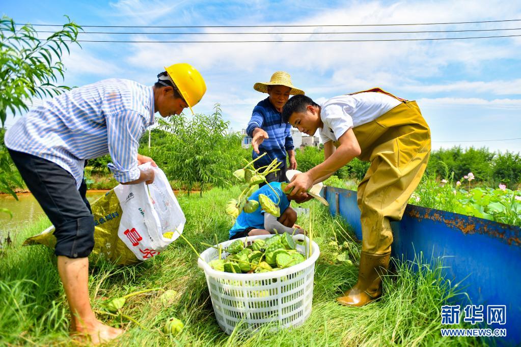 7月11日,在湖南省湘潭市雨湖区姜畲镇联映村,莲农收集采摘好的莲蓬。新华社记者 陈泽国 摄