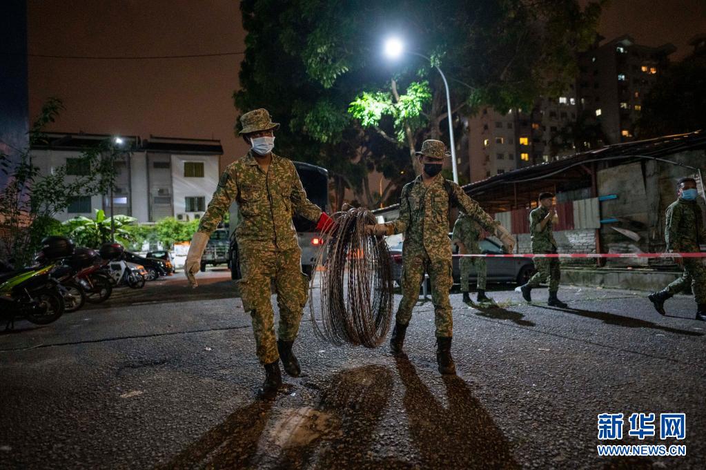 7月10日深夜,士兵在马来西亚吉隆坡郊区一个实行“加强行动管制令”的社区安装铁丝网。
