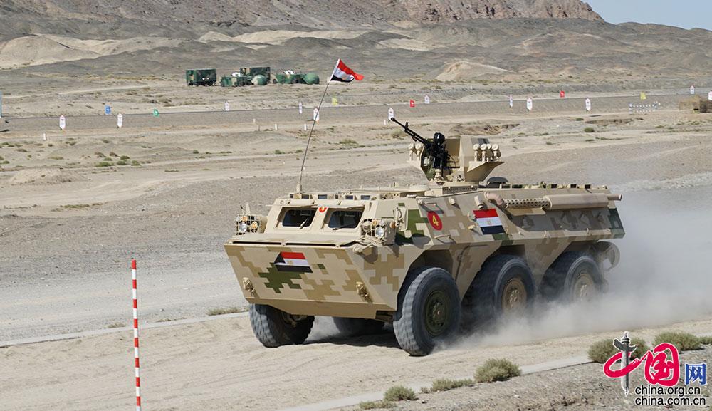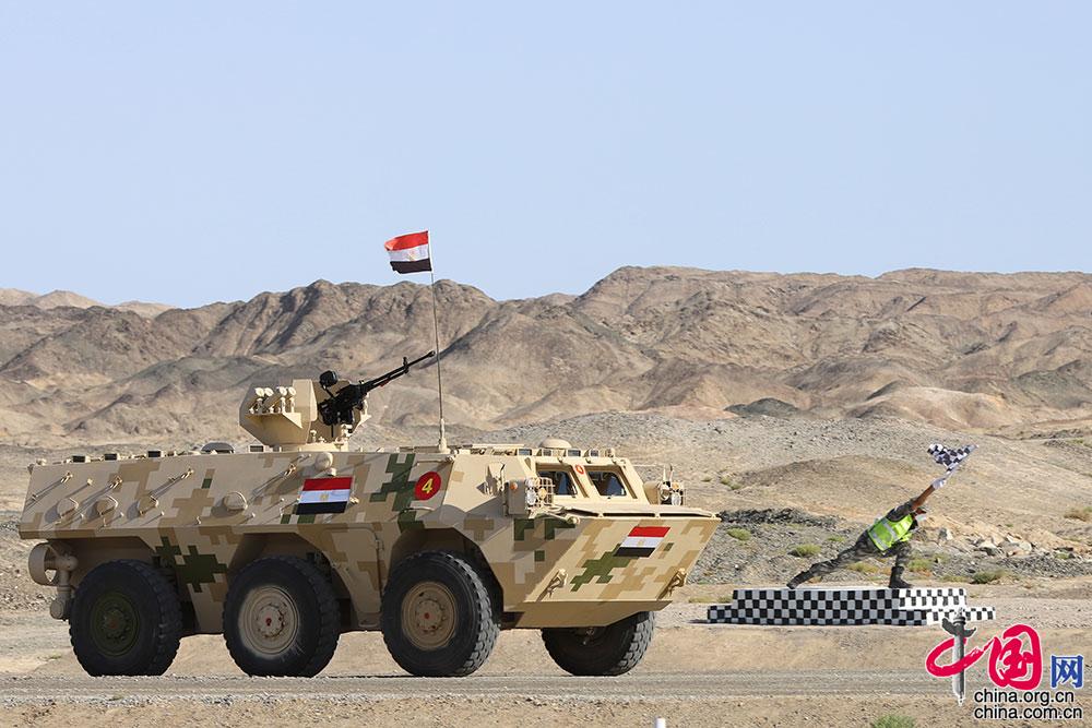 “裁判长同志,埃及队准备完毕,请指示!”“开始!”随着裁判长一声令下,步战车冲出起点线。首先出场的埃及参赛队,过水场、跨壕沟,进行实弹射击,一路驶向终点。随后,委内瑞拉和俄罗斯参赛队也先后驶出了起点。