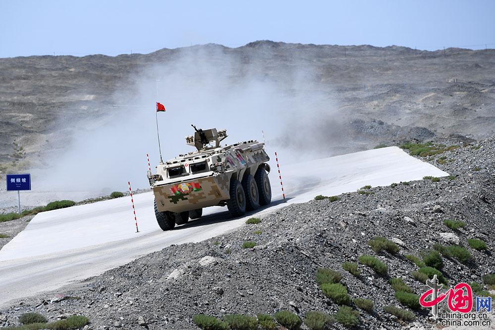 8月24日,“国际军事比赛-2021”中国库尔勒赛区“晴空”项目首场比赛技能赛在库尔勒开赛,中国参赛车组通过土岭。张永进 摄