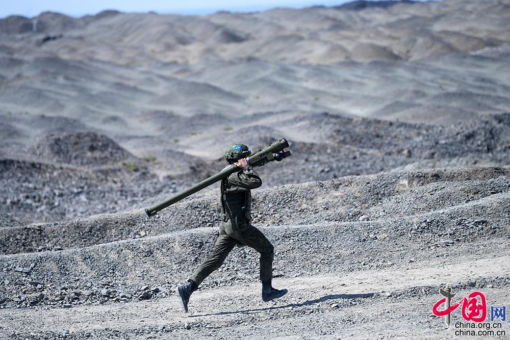 8月24日,“国际军事比赛-2021”中国库尔勒赛区“晴空”项目首场比赛技能赛在库尔勒开赛,俄罗斯参赛队员向导弹发射区前进。张永进 摄