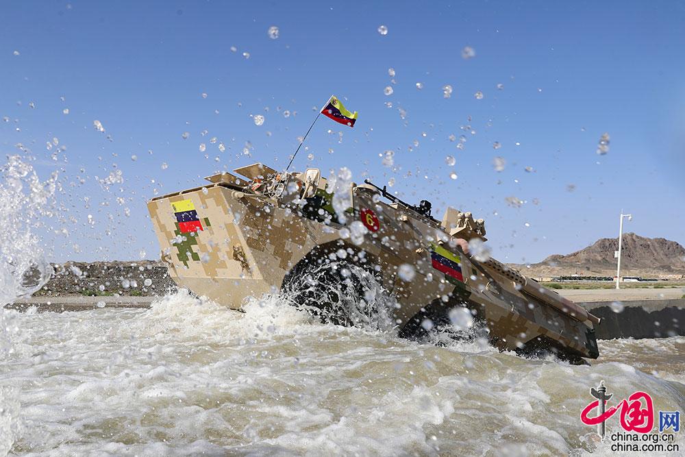 8月24日,“国际军事比赛-2021”中国库尔勒赛区“晴空”项目首场比赛技能赛在库尔勒开赛,委内瑞拉参赛车组通过涉水场。姜东坡 摄