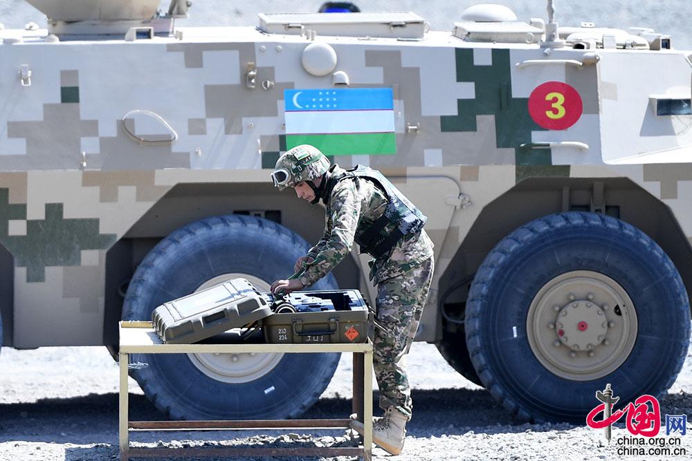 8月24日,“国际军事比赛-2021”中国库尔勒赛区“晴空”项目首场比赛技能赛在库尔勒开赛,乌兹别克斯坦参赛队员下车取弹。 张永进 摄