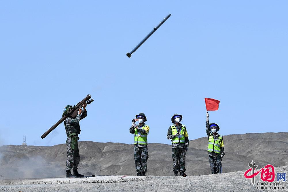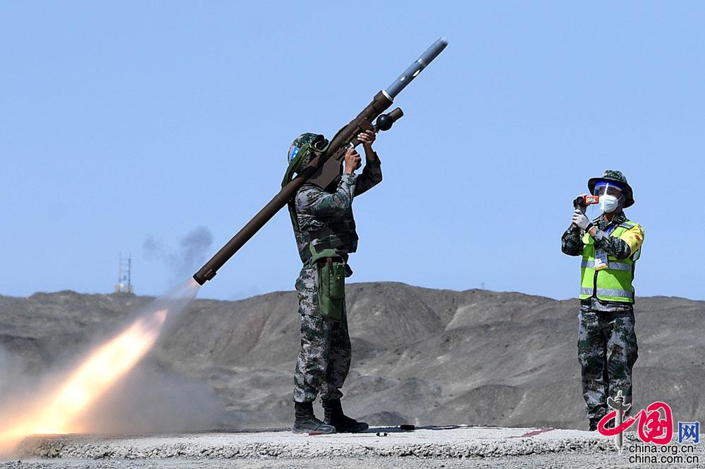 8月24日,“国际军事比赛-2021”中国库尔勒赛区“晴空”项目首场比赛技能赛在库尔勒开赛,中国参赛队员发射便携式防空导弹。 张永进 摄