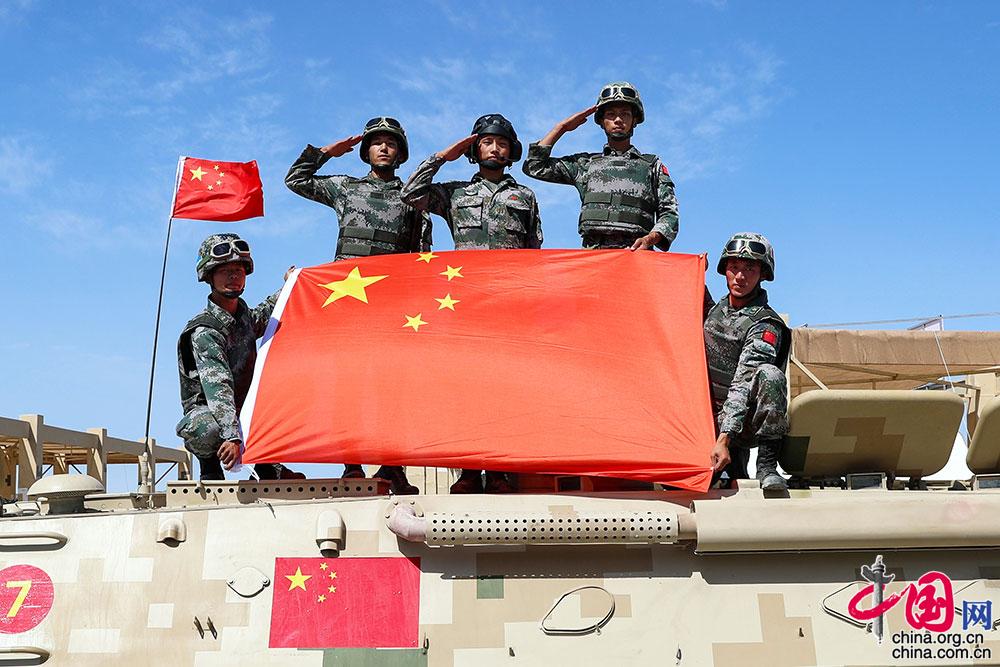8月24日,“国际军事比赛-2021”中国库尔勒赛区“晴空”项目首场比赛技能赛在库尔勒开赛,中国参赛队员赛后与国旗合影。姜东坡 摄