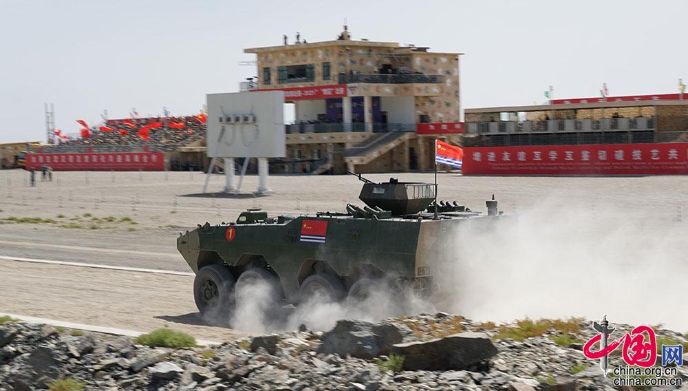 8月24日,“国际军事比赛-2021”中国库尔勒赛区“晴空”项目首场比赛技能赛在库尔勒开赛,中国海军参赛车组全力冲向终点。郭中正 摄