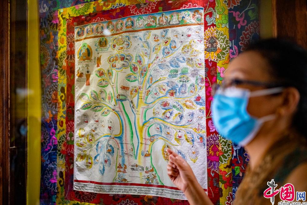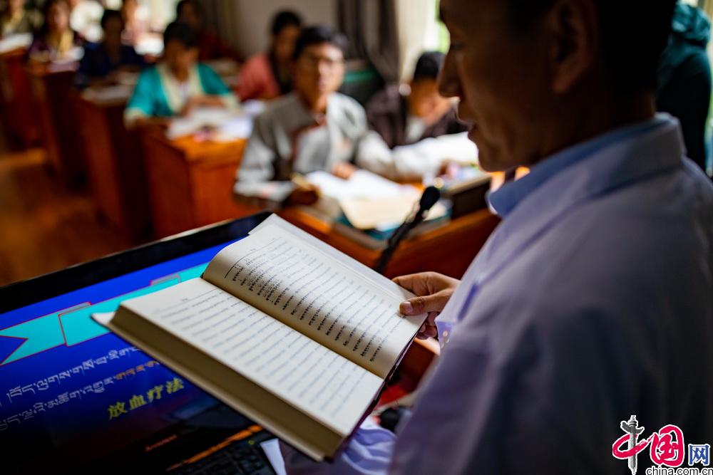 西藏藏医药大学开设特色鲜明的藏医药学唐卡教学课程。现有医学唐卡由十七世纪藏医药大家第司.桑杰嘉措创建,距今已有300多年的历史。医学唐卡用归纳、总结的方式将藏医药典籍《四部医典》的主要内容以“树喻”方式绘示出来。成书于1300多年的《四部医典》是藏医药学理论的根本大典。包括总则医典、论述医典、秘诀医典和后续医典。内容涵盖藏医生理学、病理学、诊断学、治疗学等基础理论,细化了妇科、儿科、内科、外伤等学科,包含了解剖学、护理学、药学等众多学科。图为学校老师在对医学唐卡进行讲解。中国网记者 郑亮摄