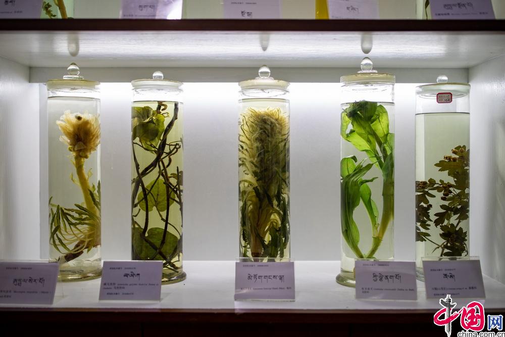 学校目前在藏药新药研发方面正在进行“四臣止咳液”、“降糖灵”、“清血康”等藏药的研发,同时研发出了藏药牙膏、藏药面膜等延伸产品。在药材种植方面,积极开展了濒危藏药材的种植攻关工作,先后对喜马拉雅紫茉莉、 船形乌头、红景天等濒危藏药通过项目进行育苗、种植等。图为西藏藏医药大学内所陈列的藏药标本。中国网记者 郑亮摄