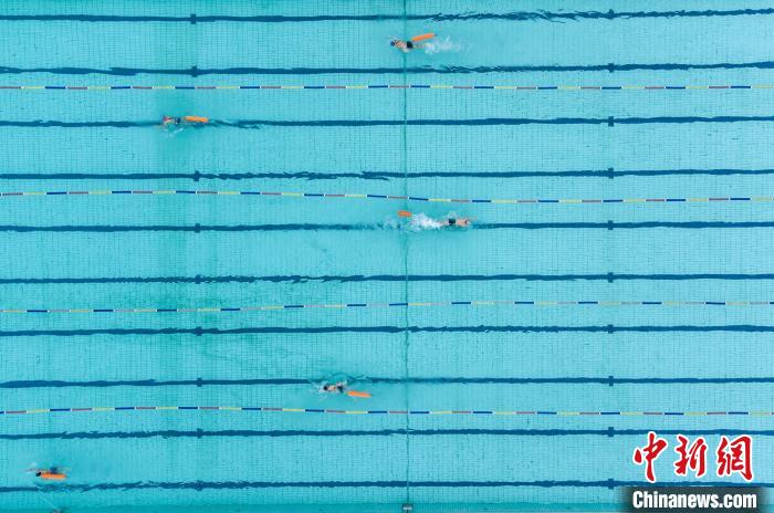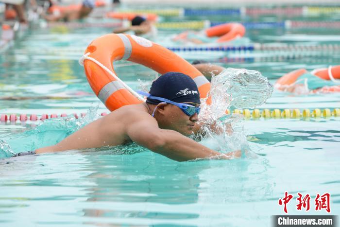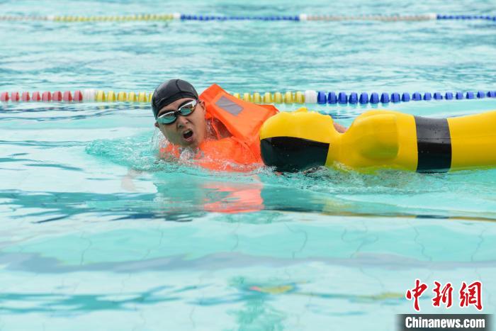 图为参赛选手在携带救生浮具救生竞赛中。 何蓬磊 摄