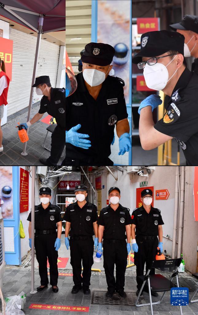 拼版照片:上三图为在厦门疫情管控小区惠祥花园小区,社区党员志愿者在核酸检测点维持秩序,帮助群众搬运快递物品;下图为社区党员志愿者合影(9月16日摄)。