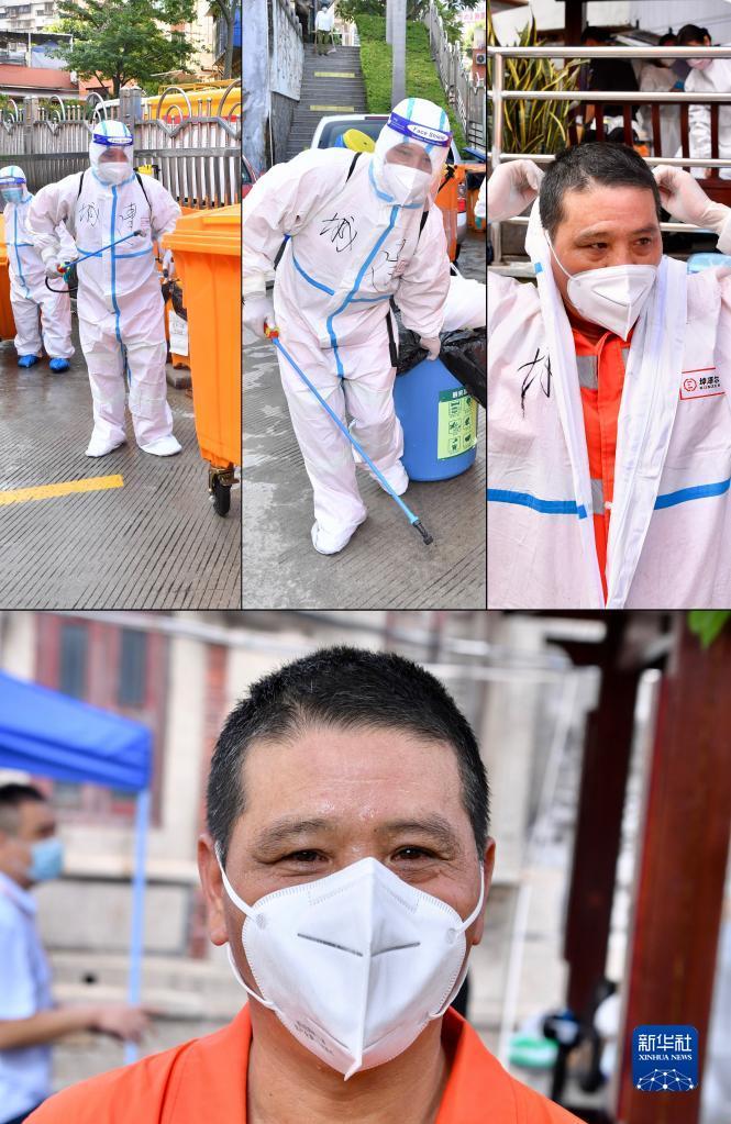 拼版照片:上三图为保洁员林安仁在厦门市思明区疫情管控社区仁安社区进行消杀和垃圾转运工作;下图为林安仁脸上布满汗水(9月16日摄)。今年53岁的林安仁是一名保洁员,疫情发生后,他主动报名前往疫情管控社区工作。 新华社记者 姜克红 摄