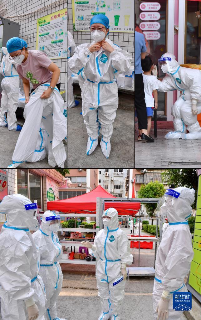 拼版照片:上三图为厦门筼筜街道社区卫生服务中心的医务工作者李莹来到因疫情管控的惠祥花园小区,开展核酸检测工作;下图为李莹(右二)为同事分配工作(9月16日摄)。李莹是厦门筼筜街道社区卫生服务中心的主管护师,疫情发生后毅然投身抗疫一线,带队负责管控区惠祥花园小区的核酸采样工作。