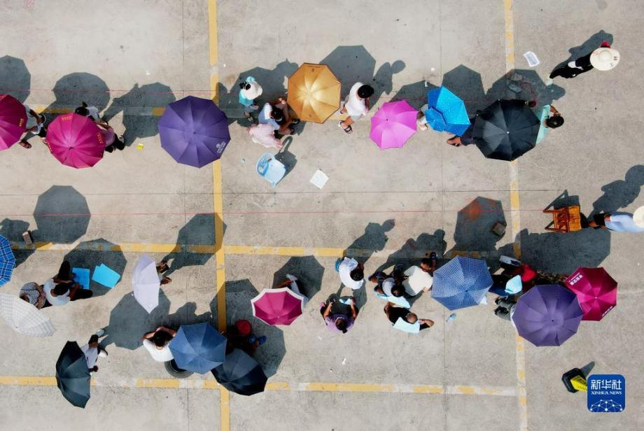 在莆田仙游县鲤城街道坝垅社区核酸检测点,社区干部(右侧戴草帽者)在维持现场秩序(9月17日摄,无人机照片)。 新华社记者 魏培全 摄