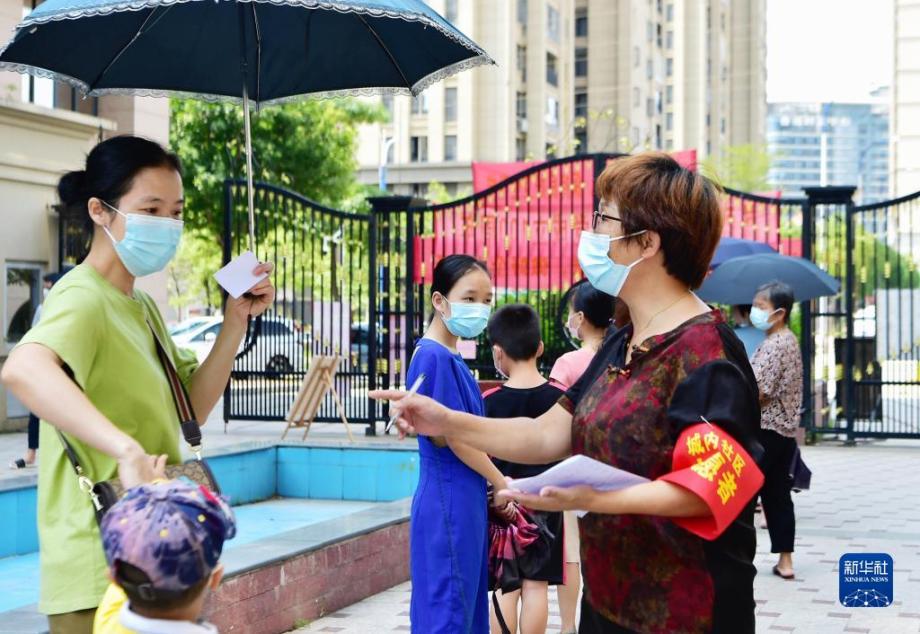 9月17日,在莆田仙游县鲤城街道坝垅社区,社区安保人员(右一)给进出社区的小孩子测量体温。 新华社记者 魏培全 摄