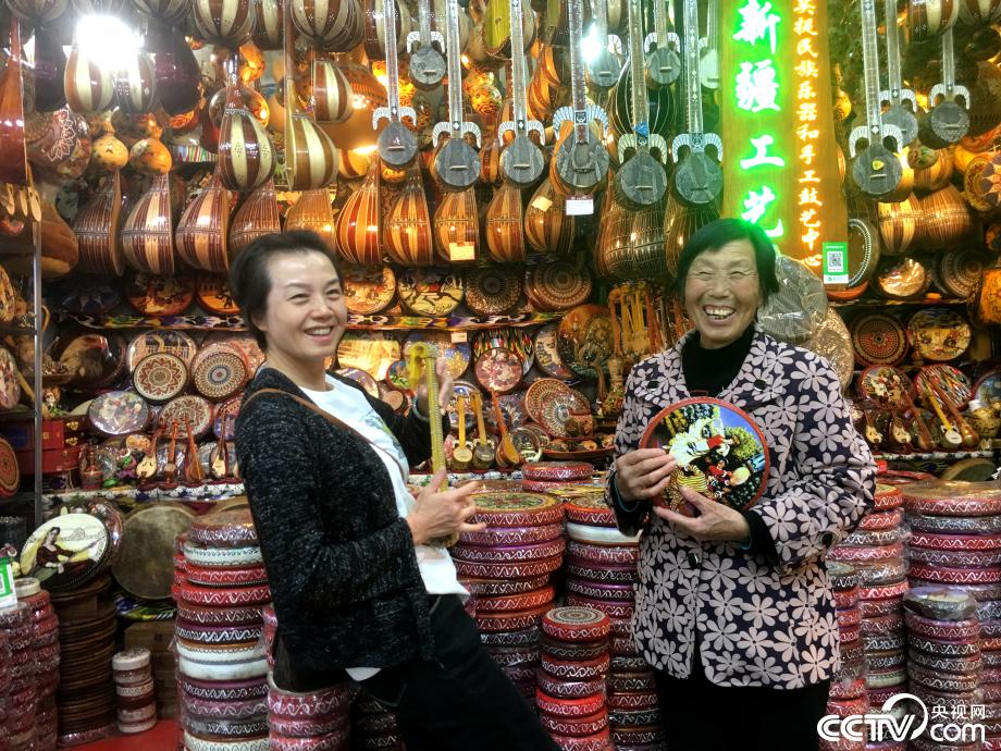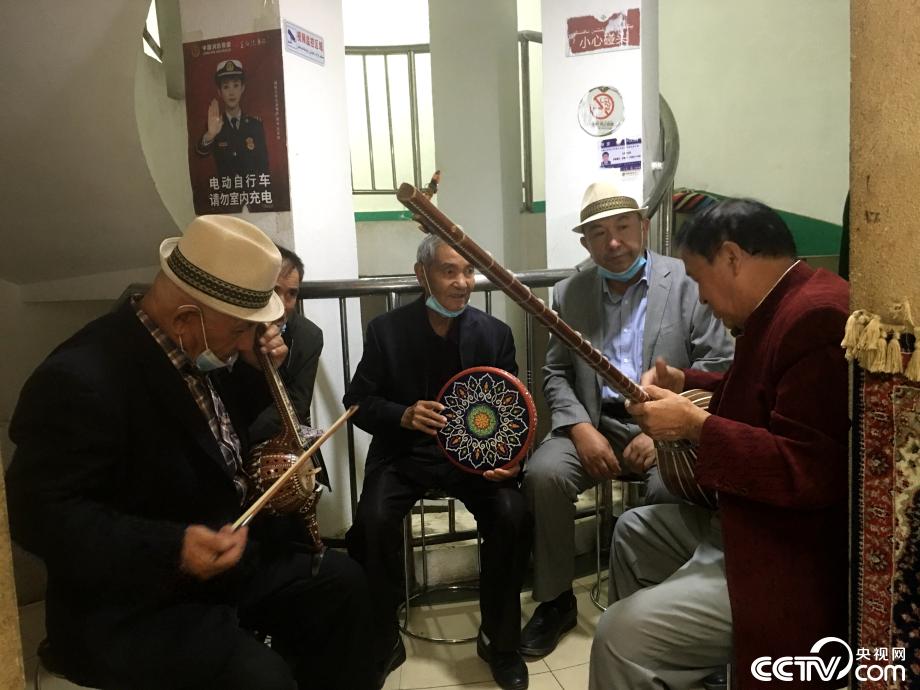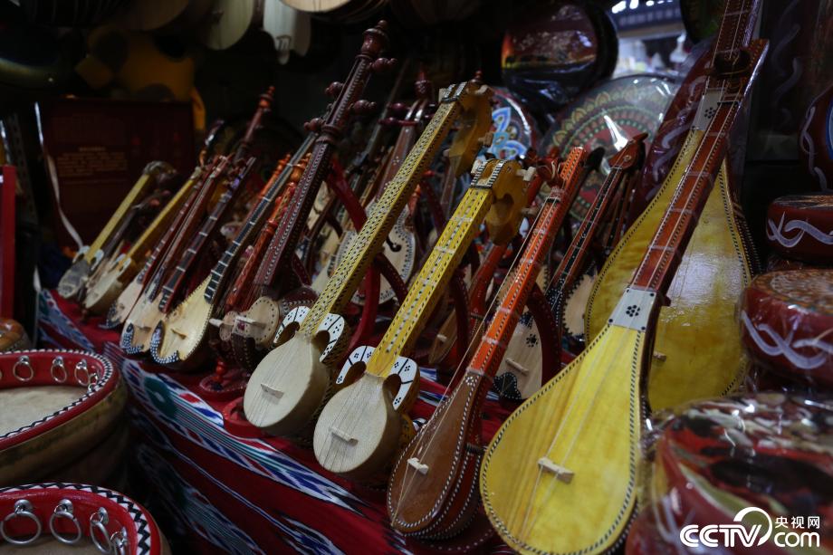 在新疆国际大巴扎,这几位是一家乐器店店主的朋友,他们相约来大巴扎,在方寸间弹唱起来,吸引了不少游客驻足观看。