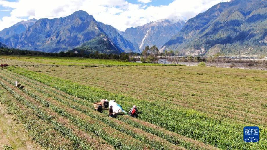 10月18日,易贡茶场职工在采茶(无人机照片)。近期,西藏林芝市易贡茶场进入秋茶采摘季,茶园里一片繁忙景象。新华社记者 晋美多吉 摄