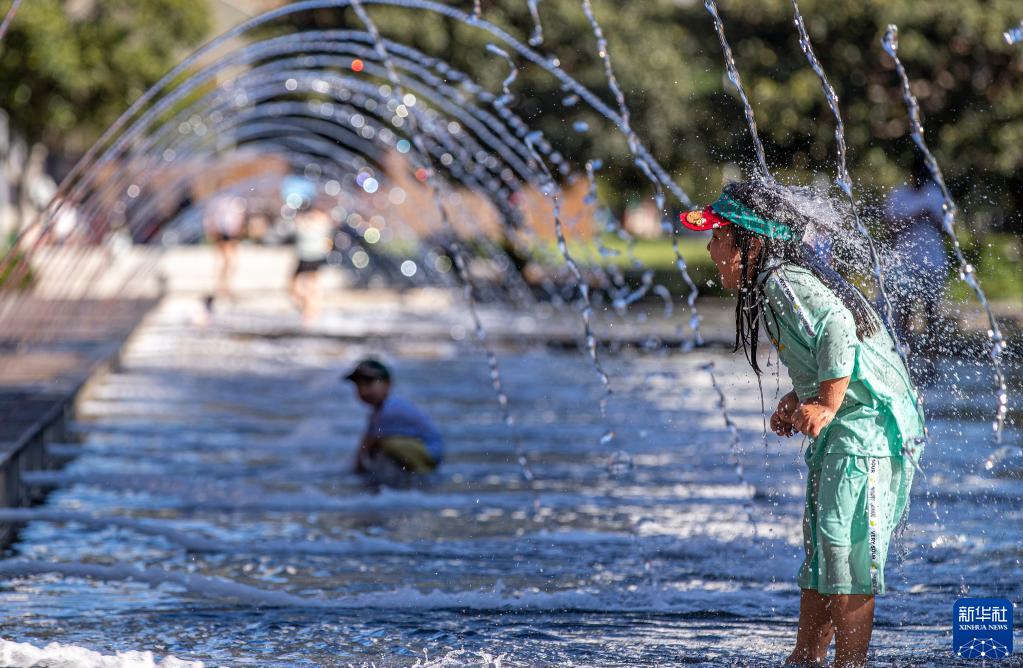 10月18日,儿童在澳大利亚悉尼一处户外喷水池玩耍。