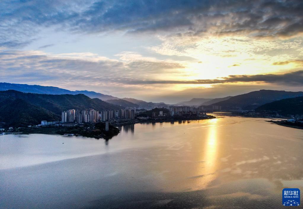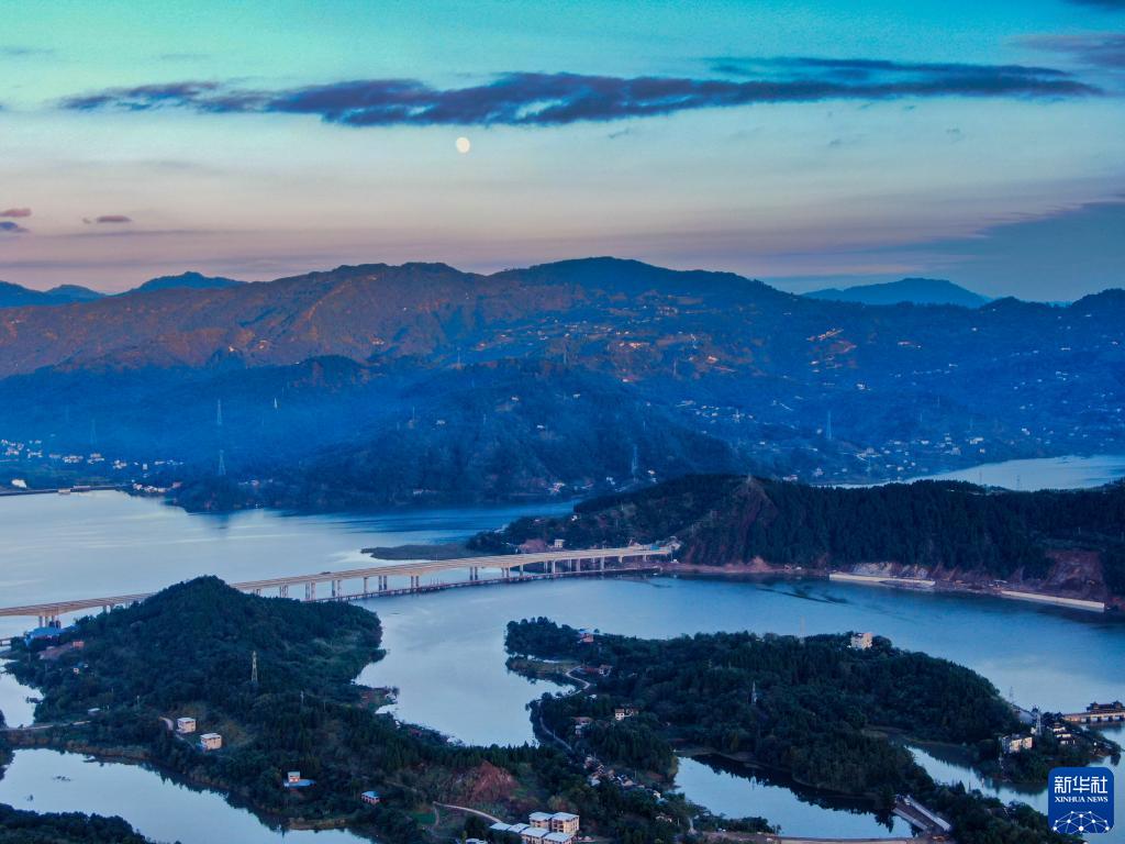 落日余晖下的重庆开州区汉丰湖景色(10月18日摄)。