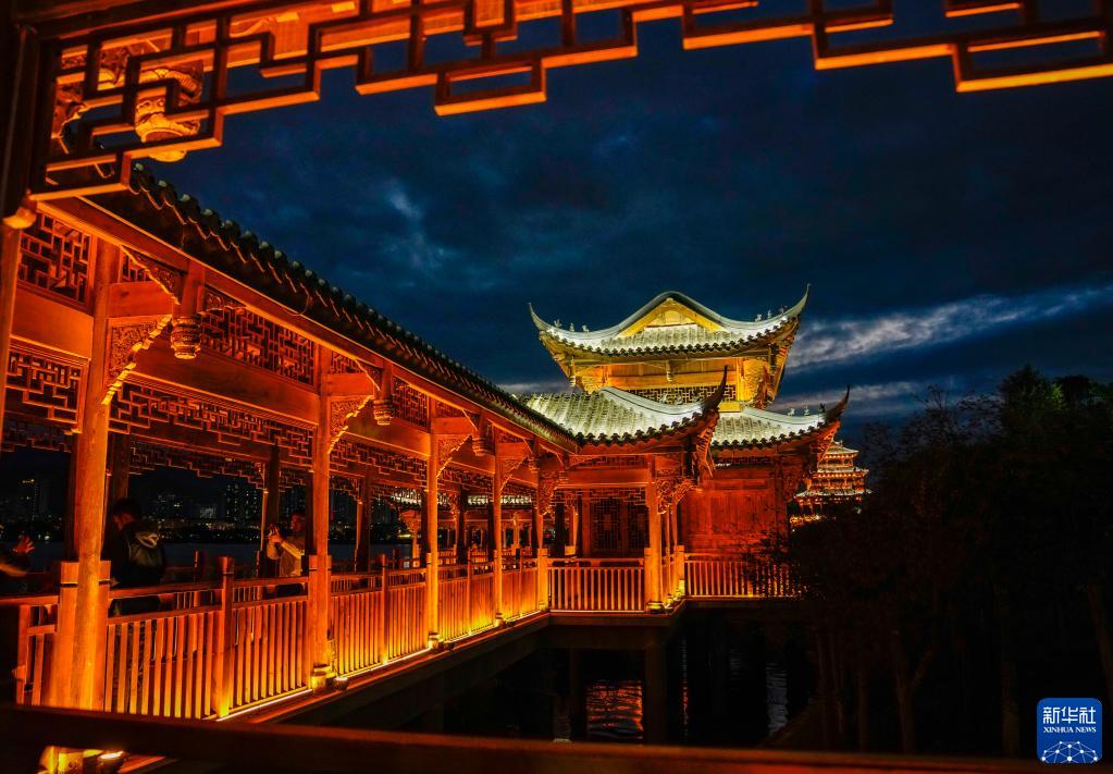 重庆开州区汉丰湖湖畔开州故城景区的滨湖廊道夜景(10月18日摄)。