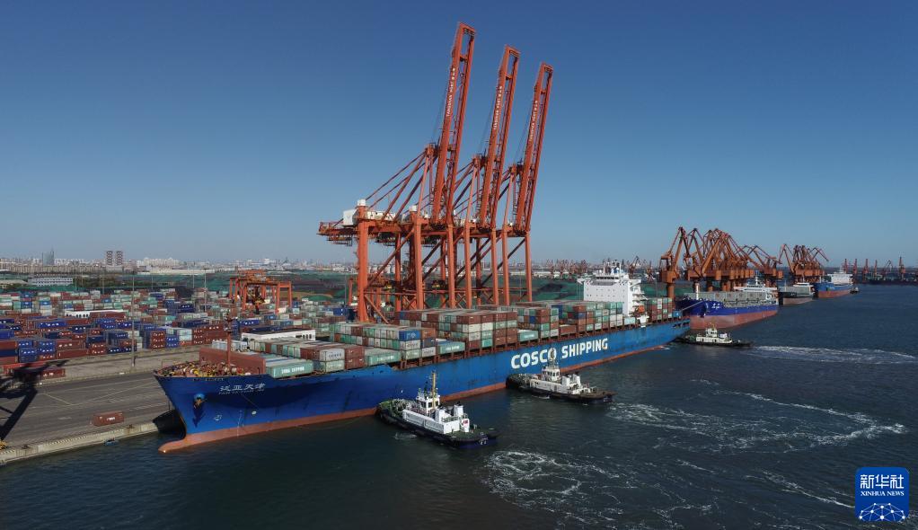 一艘轮船在拖轮的协助下向唐山港京唐港区集装箱码头靠泊(2021年10月23日摄,无人机照片)。新华社记者 朱旭东 摄