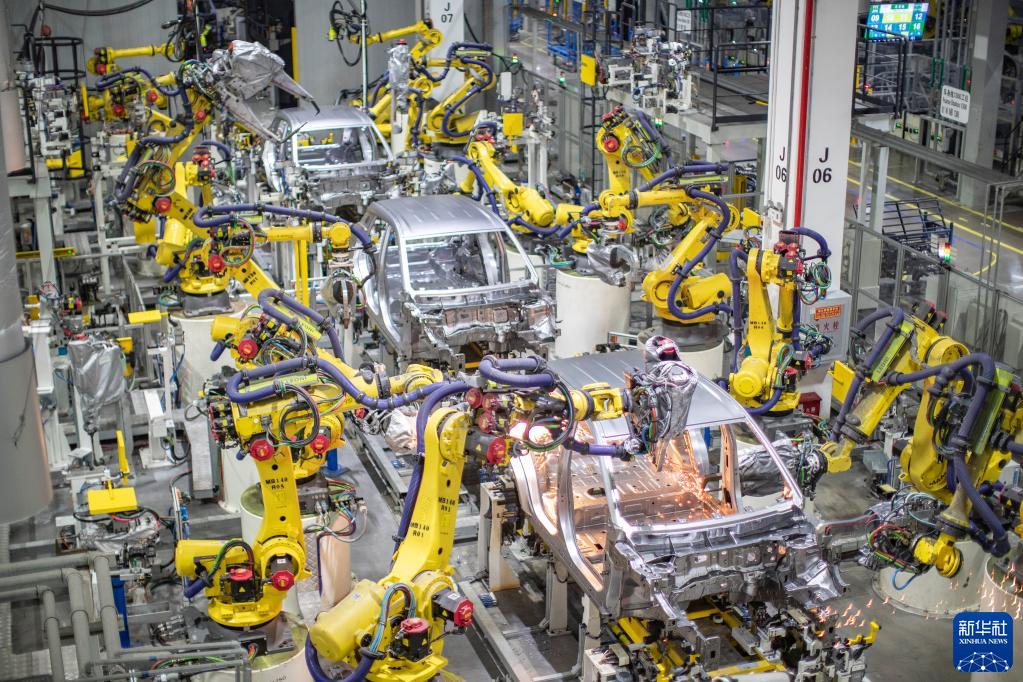 重庆一家新能源汽车企业使用智能化焊接机器人进行焊接作业(2021年4月2日摄)。新华社记者 黄伟 摄
