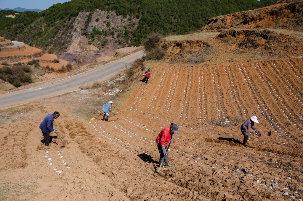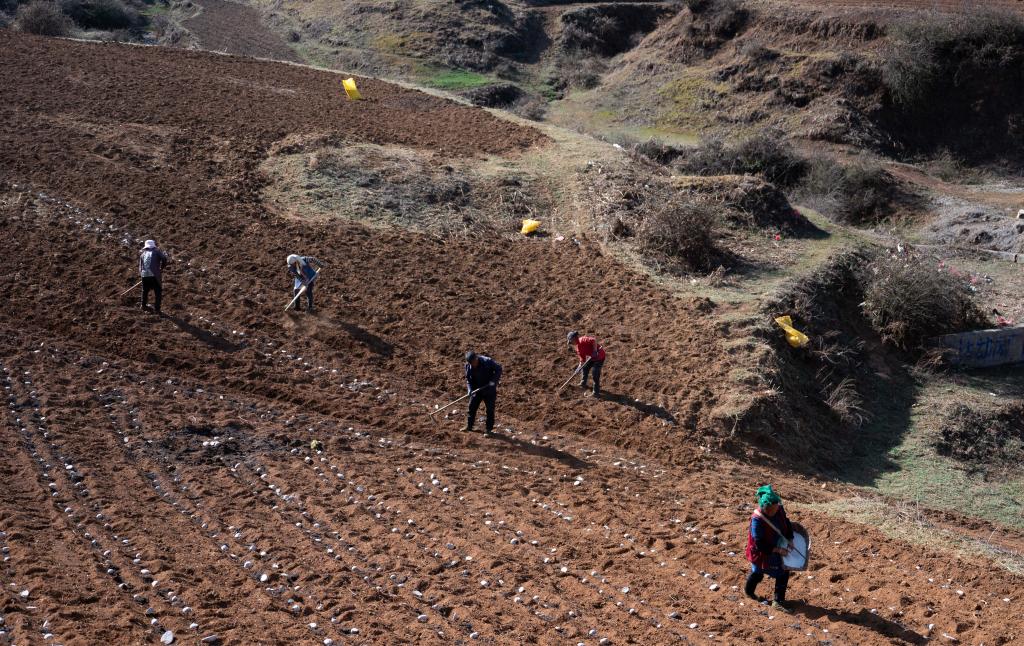 平整土地、播种、施肥……在云南省昭通市鲁甸县水磨镇,不少村民在连片的马铃薯种植基地忙碌着。27岁的拖麻村村民杨富兴弯着腰,顺着笔直的沟垄播种。他说:“我们要干到下午6点,大家都希望多种点。”