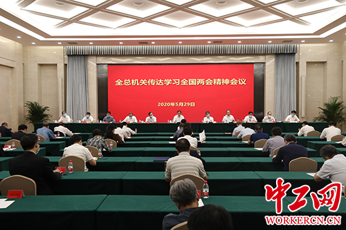 中工网北京5月29日电 (工人日报-中工网记者张锐 郝赫 通讯员康健)全国总工会今天召开会议,传达学习十三届全国人大三次会议和全国政协十三届三次会议精神。全总党组书记、副主席、书记处第一书记李玉赋主持会议并讲话,强调要把学习宣传贯彻全国两会精神作为当前和今后一个时期的重要政治任务,按照全国人大常委会副委员长、中华全国总工会主席王东明要求,切实把思想和行动统一到党中央科学判断和决策部署上来,践行初心使命、忠诚履职尽责,为确保完成决战决胜脱贫攻坚目标任务,全面建成小康社会作出新的贡献。