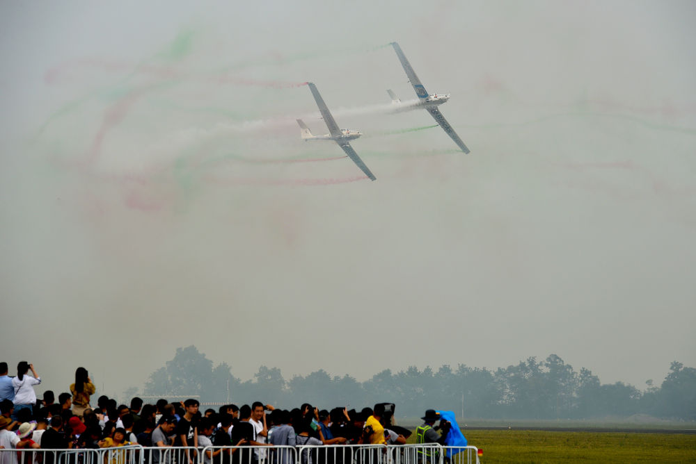 2019年四川国际航空航天展览会开幕当日,在德阳市广汉机场,英国空中焰火表演队飞过观众席。 新华社发(王曦摄)