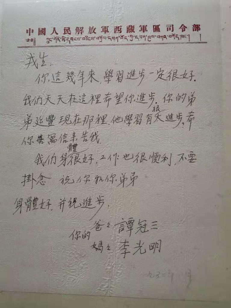1952年8月,谭戎生11岁那年,谭冠三在西藏给他写了第一封家书,而此时距两人上次见面,已相隔5年之久了。