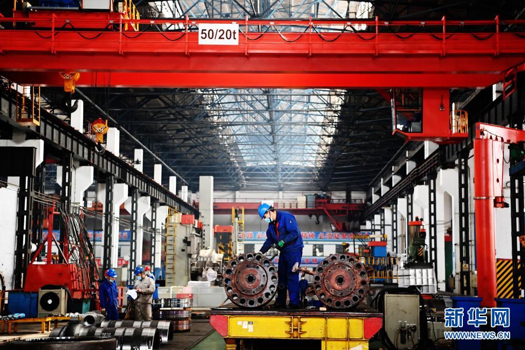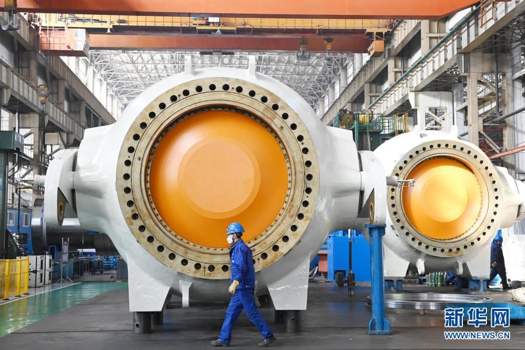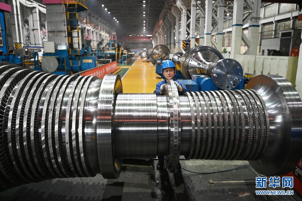 工人在哈电集团哈尔滨汽轮机厂有限责任公司生产车间作业(4月15日摄)。新华社记者 王建威 摄