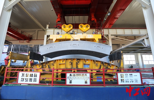 真空吸盘从模具中吊起管片运送至翻转机上大约需要3分钟,为确保万无一失,他们在通道下方设置了一层钢模隔板,为安全生产上了“双保险”。