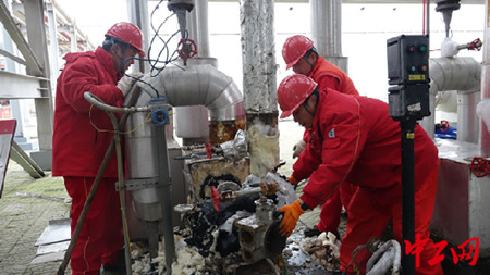 生产运行班员工吴亚然和胡晓磊首先对增压泵外保温壳进行拆解,清理保温棉,由于长时间低温运行,保温棉冷冻结冰清理十分困难,经过2个多小时的清除才将泵体展露出来。随后,他们一起对屏蔽泵完成了拆除和更换工作,最终将故障排除,设备恢复正常。