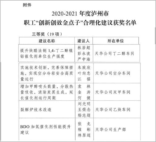 12月13日,泸州市总工会发布2020—2021年度职工“创新创效金点子”合理化建议征集活动评审结果通报,四川天华股份有限公司职工完成的《提升炔醛法制1,4-丁二醇镍铝催化剂单位生产强度》、《实施技术创新,完善保障措施,实现空分冷箱安全高质量运行。》等获评三等奖。