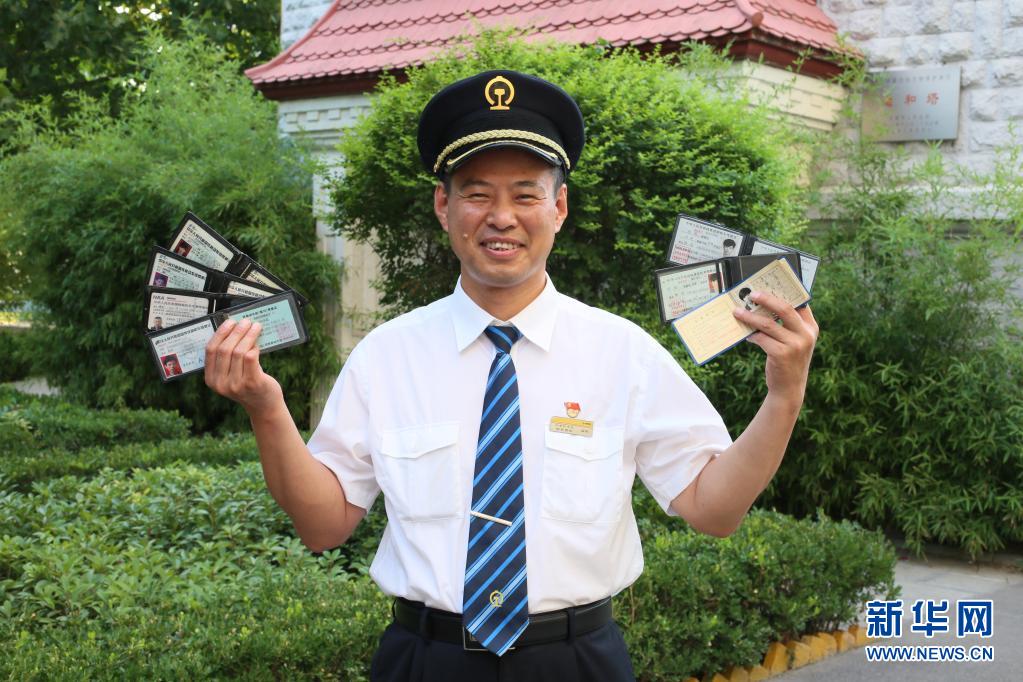 中国铁路济南局集团有限公司济南机务段动车组司机薛军展示他的7本“驾照”。新华社发(中国铁路济南局集团公司供图)